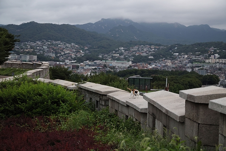 ソウル市内を望む公園にやってくると昔の城壁に暮らすネコに出あう。かわいい三毛は公園にやってくる人にポーズをとって写真撮影。